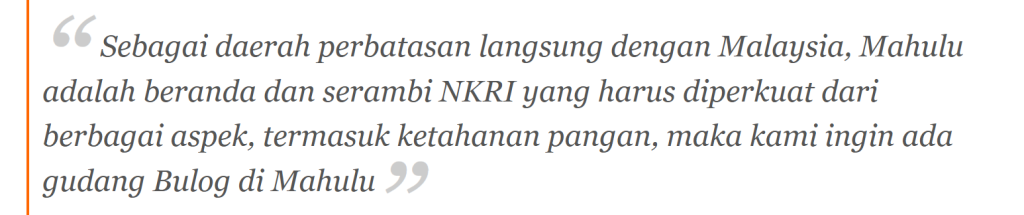 Sedangkan Sekretaris Daerah Kabupaten Mahulu Sephanus Madang mengatakan permintaan itu menjadi bagian dari komitmen Pemkab Mahulu dalam memastikan masyarakat di wilayah perbatasan mendapatkan akses pangan yang memadai dan terjangkau, sekaligus memperkuat peran Mahulu sebagai daerah strategis nasional di wilayah Kalimantan Timur.