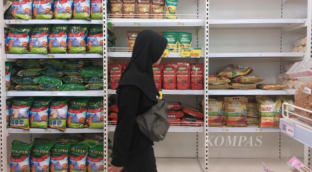Pengunjung ritel modern di kawasan Pondok Bambu, Jakarta Timur, berada di rak pajang beras yang sebagian merek produk telah kosong, Selasa (5/8/2025). Stok beras medium hingga premium di sebagian ritel modern telah menipis, bahkan di sebagian cabang ada yang sudah kosong.