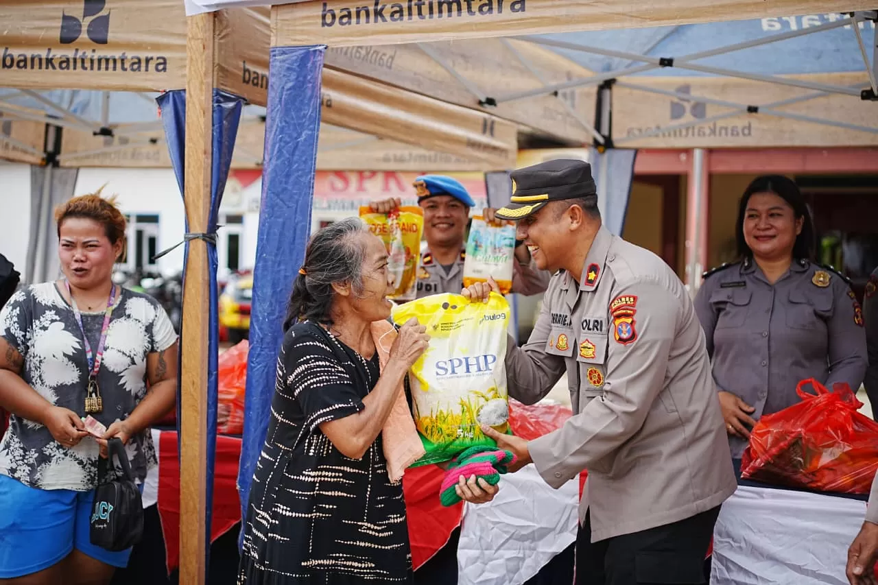 Wakapolres Mahulu Kompol Dherrie Alim menyerahkan paket pangan murah kepada pembeli dalam kegiatan GPM di Mapolres Mahulu, Selasa (12/8/2025). (JODY KRISTIANTO/KP)